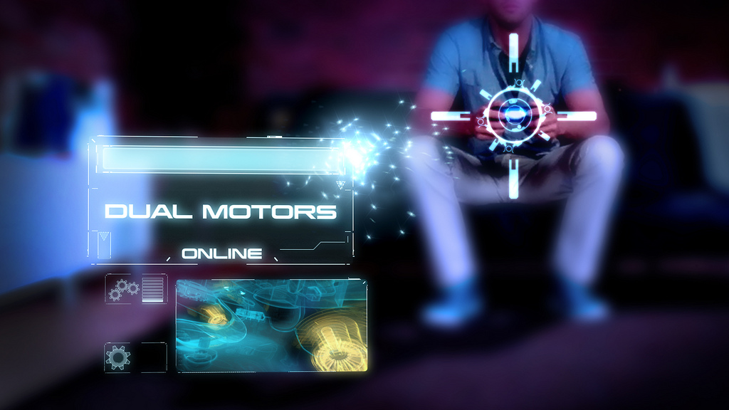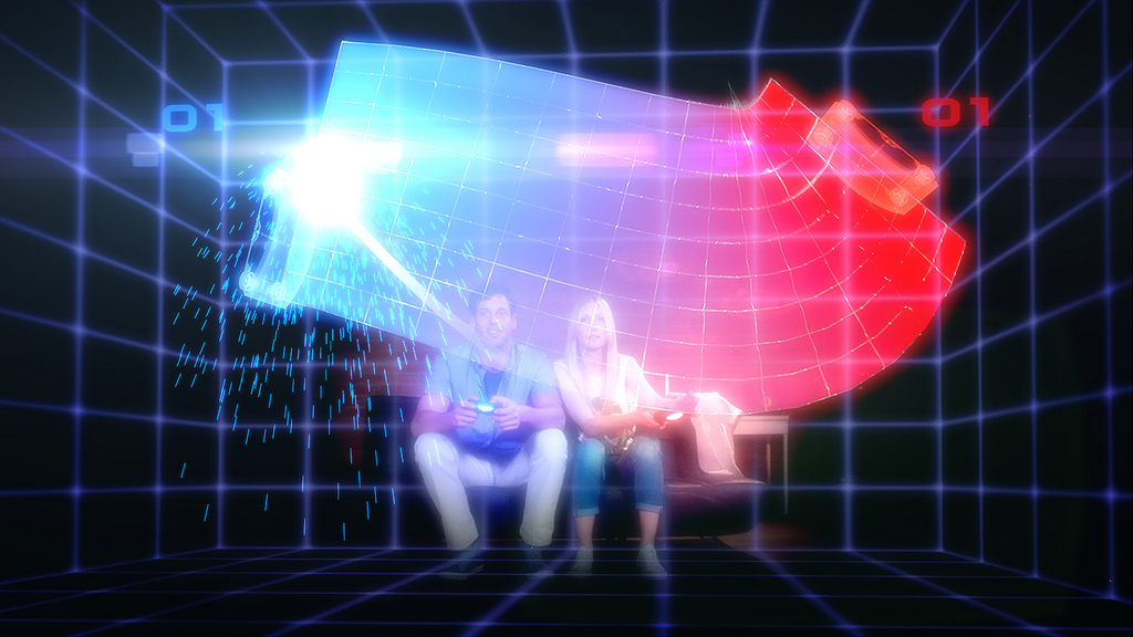 • Holographic Air Hockey game that uses a pair of DualShock 4 controllers. On the screen, the play field is projected between both controllers so each player can stretch, twist and bend it to try to get the upper hand, while using the touch pad to move the paddle up or down to return the ball.