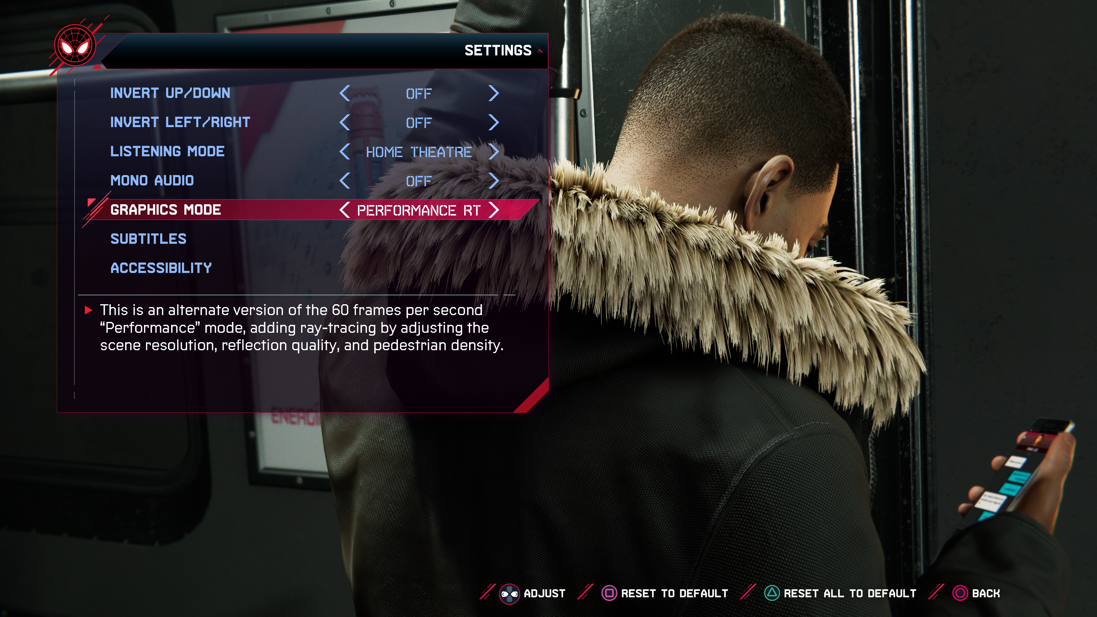 One of the changes in the game is the addition of the new “Performance RT” mode, which join the existing “Performance” and “Fidelity” modes. The Performance RT mode is an alternative version of Performance mode, which supports up to 60 FPS, but now also adds in ray-tracing by compromising on scene resolution, reflection quality and pedestrian density.