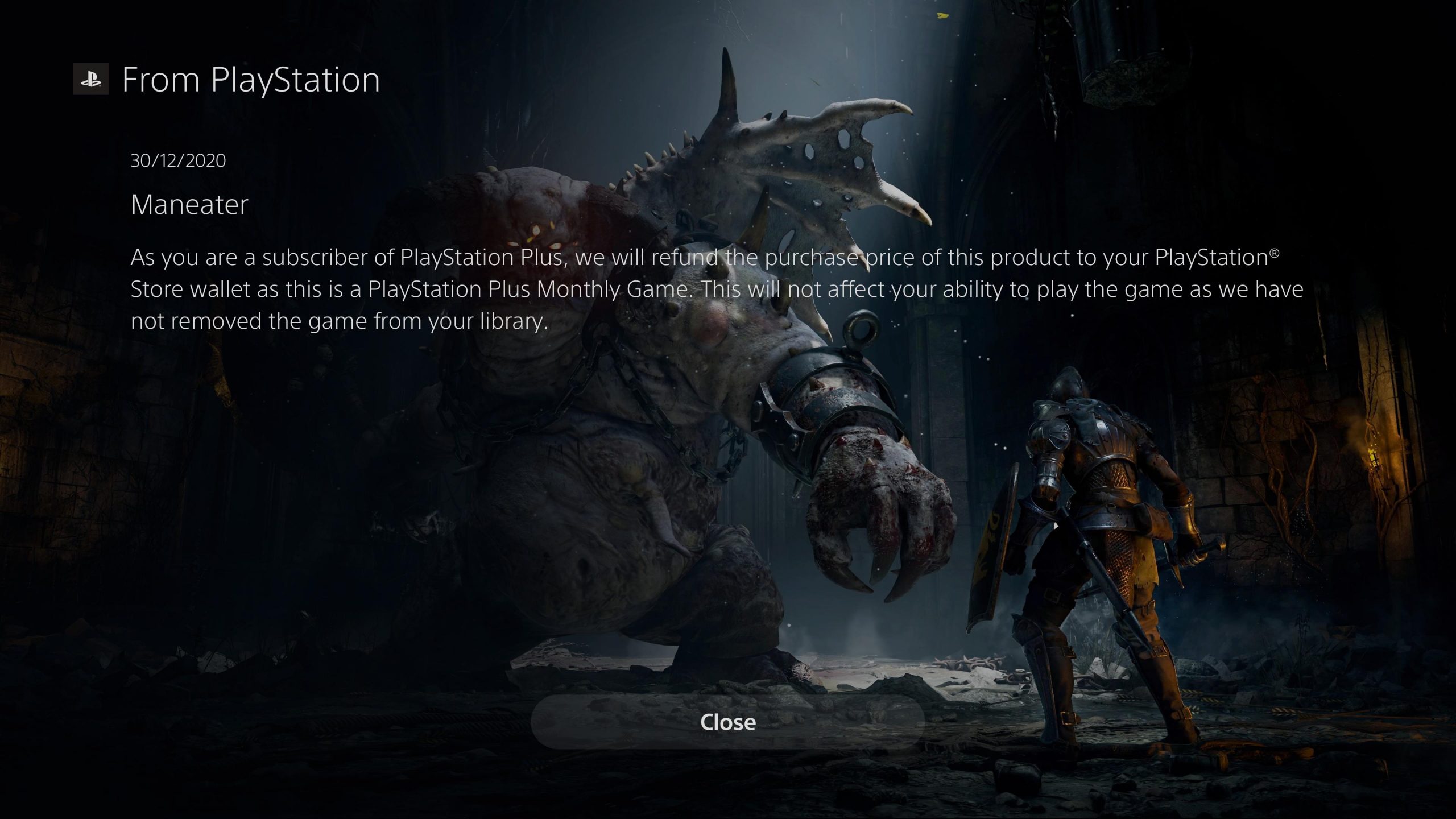 PlayStation Plus subscribers who own the digital version of Maneater have received the following message from PlayStation to their consoles: