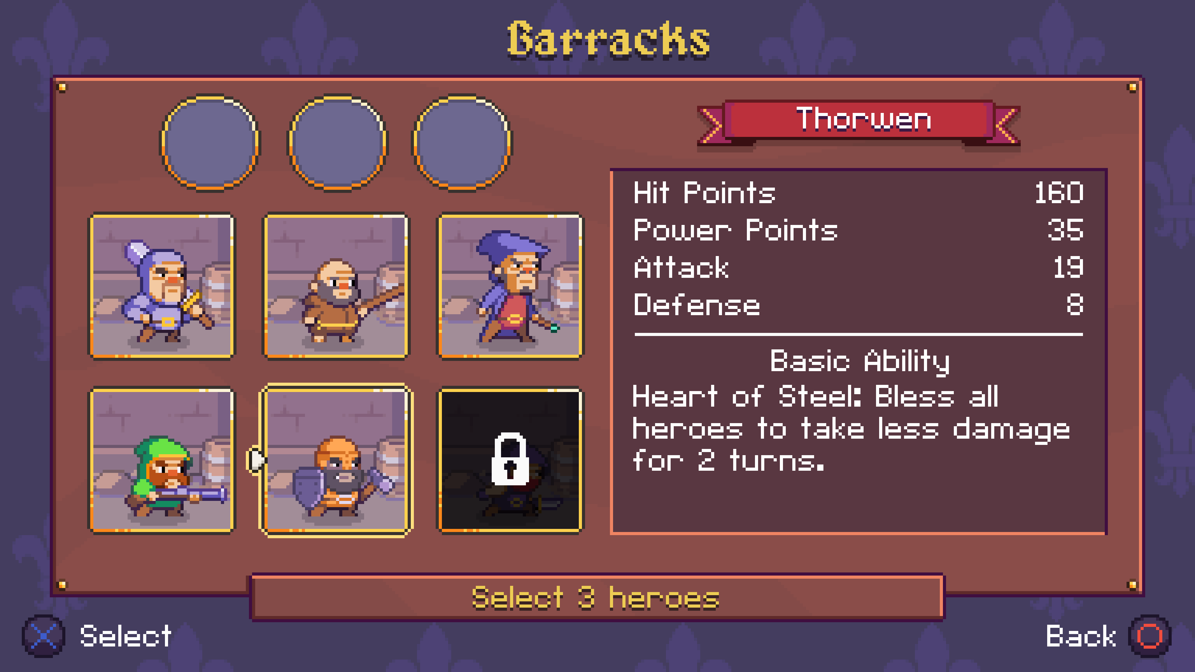 You start by selecting three characters to join you in the journey, each with their own weapon and special abilities. There are 6 characters in total, but the other three must be unlocked by completing specific requirements, for example, defeating the King Redbeard boss.