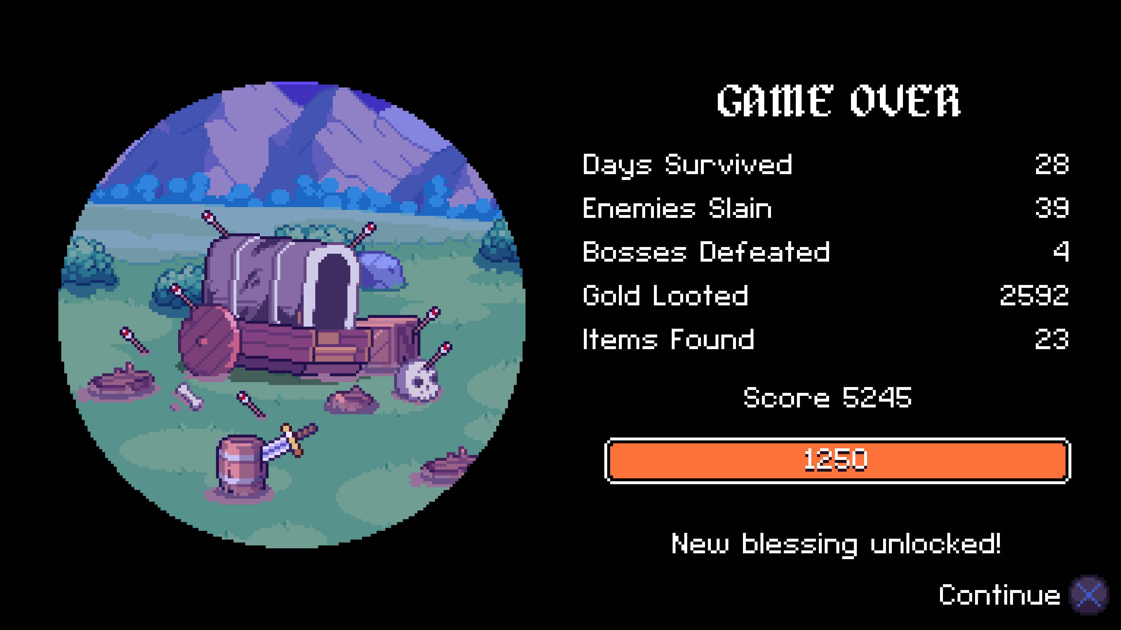 The aim of the game is to get as far as possible without dying. If you do die along the way, your final score will let you unlock new resources to use in the next run. Unfortunately, your XP, weapons and inventory are reset on each run. Each stage has 15 days, culminating in a final boss before you can access the next area (there are a total of 3 areas).